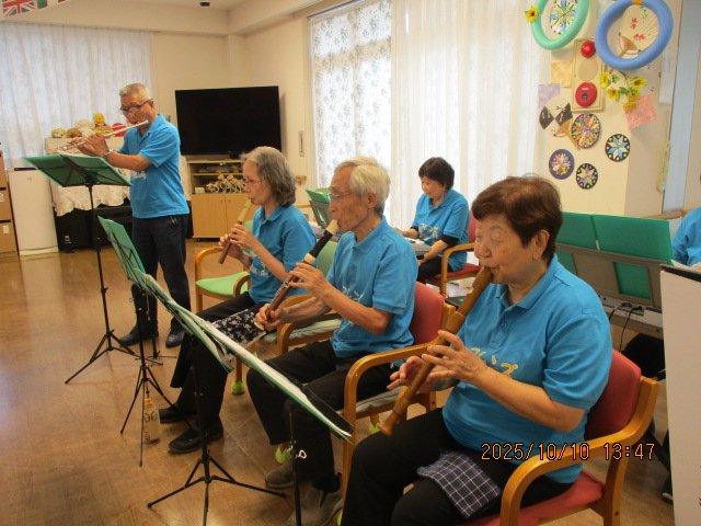 フレンズ33さんの明るい笛の音とピアノの音で利用者さんも楽しくリズムに乗って体を動かしていただきました!