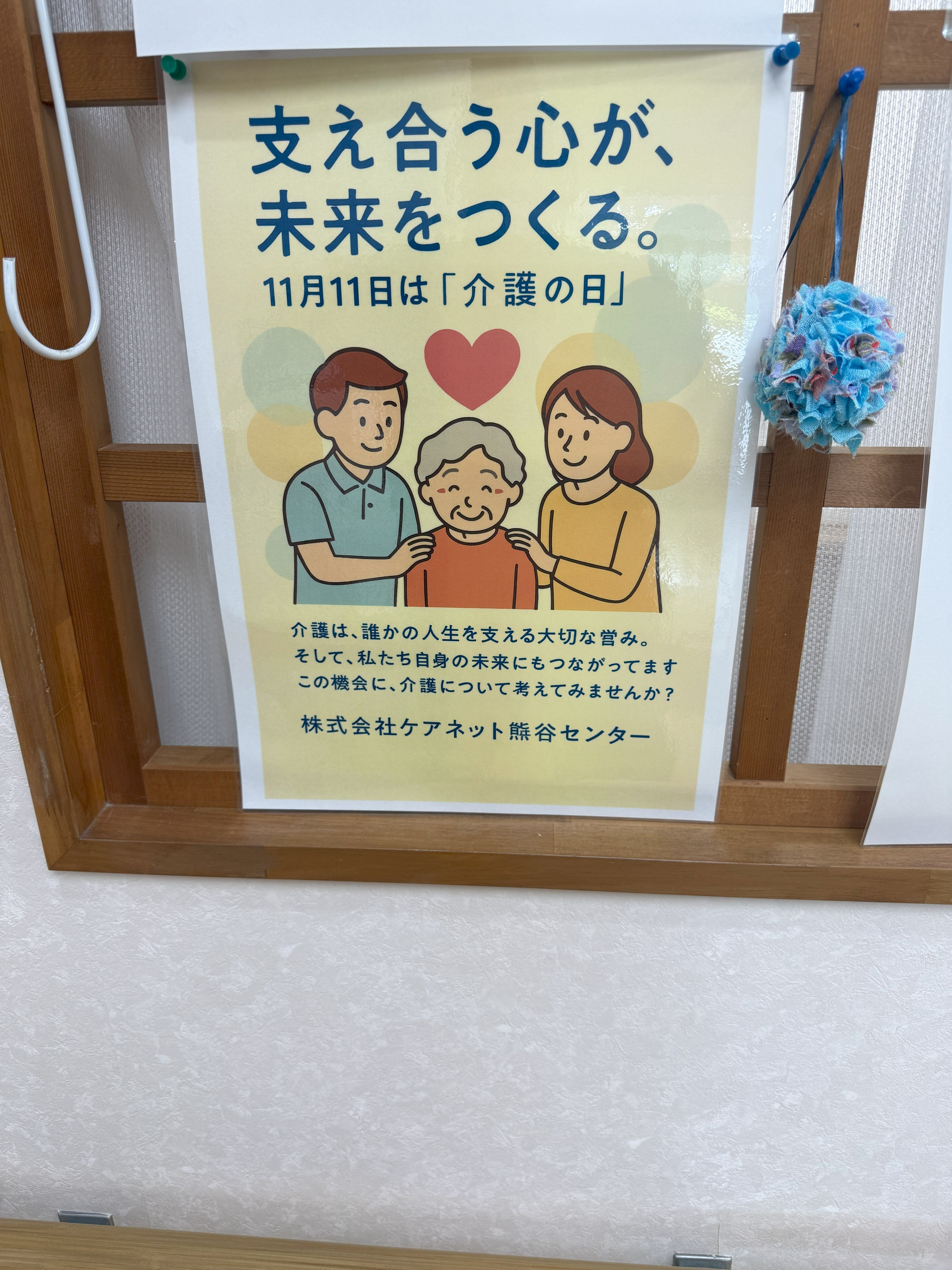 私どもの事業所内に掲示している「介護の日」のポスターです。介護を必要とする人々やその家族、介護職に対する社会的理解を深める機会です。 介護の現状や課題について広く知ってもらうことで、支え合う社会づくりを目指します。