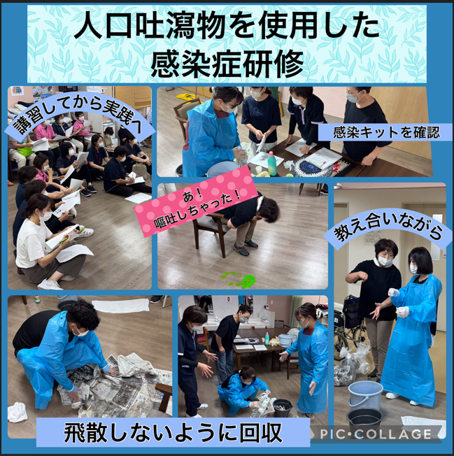 今回は、人工吐瀉物(色付けしたドロドロ液)を使って、飛散しないように回収し、感染拡大しないように、周囲を消毒しながら安全に処理するやり方を実践形式で行いました。