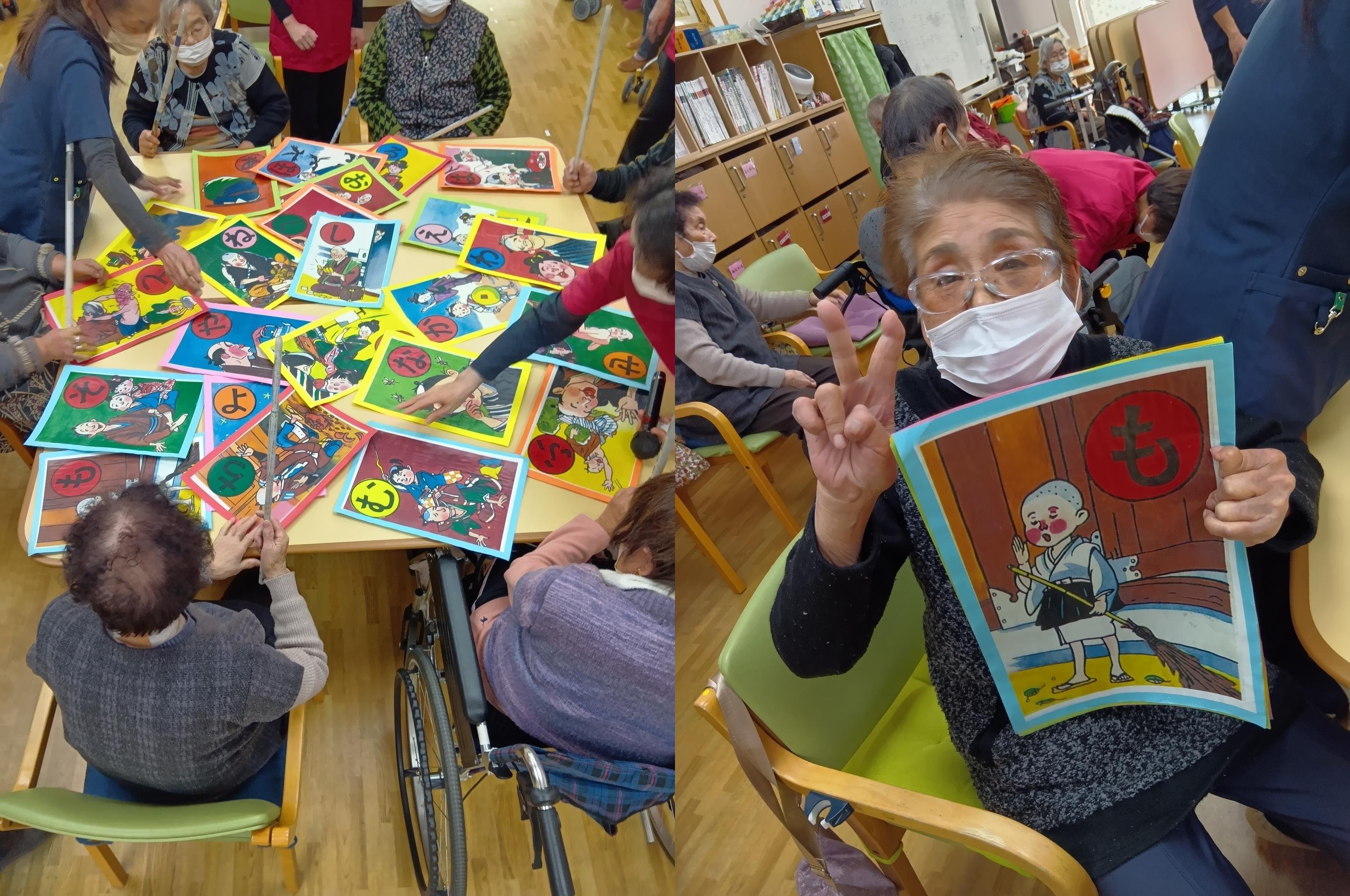 本日、デイサービスにおいて新年会を行いました。獅子舞の後に、大判かるた大会を行いました。みんな、誰よりも早くかるたをとろうと真剣でした。やりながらも笑顔が絶えず、楽しいひと時でした。