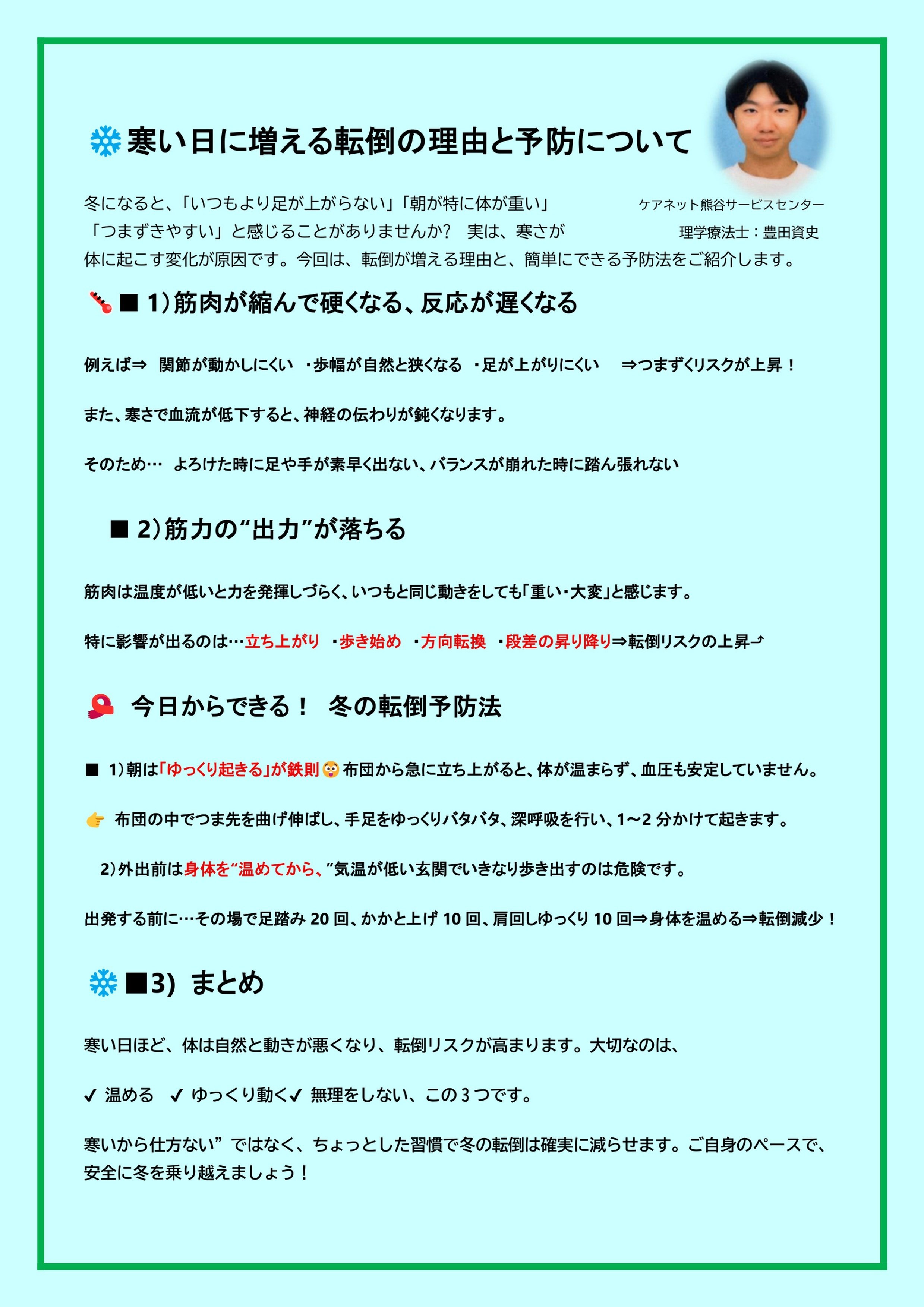 寒い日に増える転倒予防についてコラムです。冬になると体がこわばりますが、簡単にできる予防法を紹介しています。ぜひ一読を!