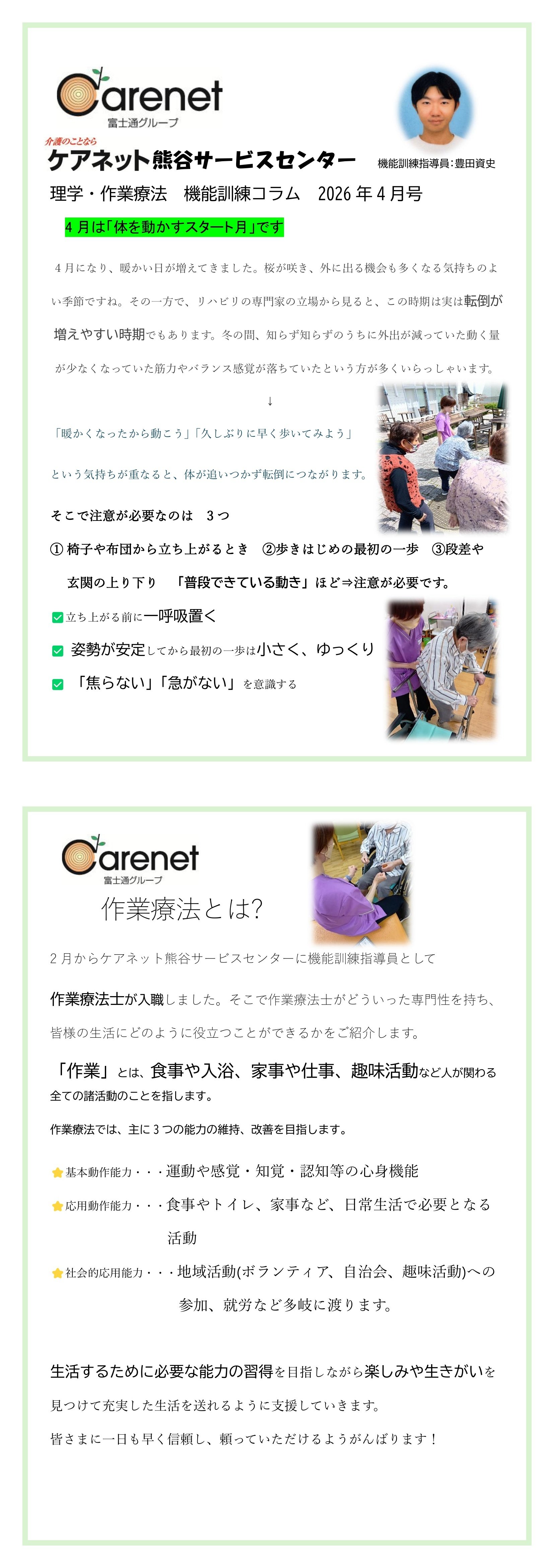 今年の2月から作業療法士が入職しています。優しい作業療法士で、ご利用者様からの評判もよく、すっかりなじんでおります。これからも、ご利用者様の日常生活がよりよく過ごせるように尽力していきます。
