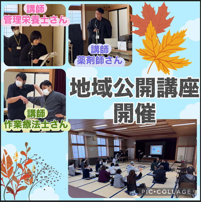 地域公開講座は、年に一回、地域住民の方々に向けて、介護に関わる講和をさせていただいています。