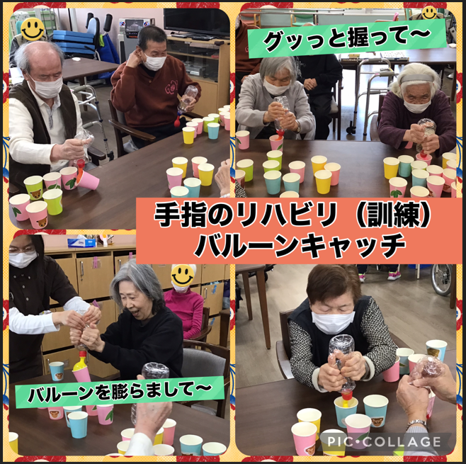 今回のレクリエーションは、手指の機能訓練(リハビリ)にも効果的なバルーンキャッチです!